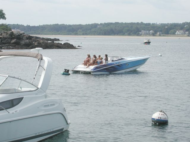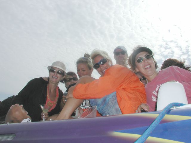 | Just about every Summer day that we're in the Cove, a Donzi shows up with a full crew of women. Just who are they??? It's time to find out. Using Shannon and Liz as bait, I decide to raft on over with my favorite bartenders and investigate. |